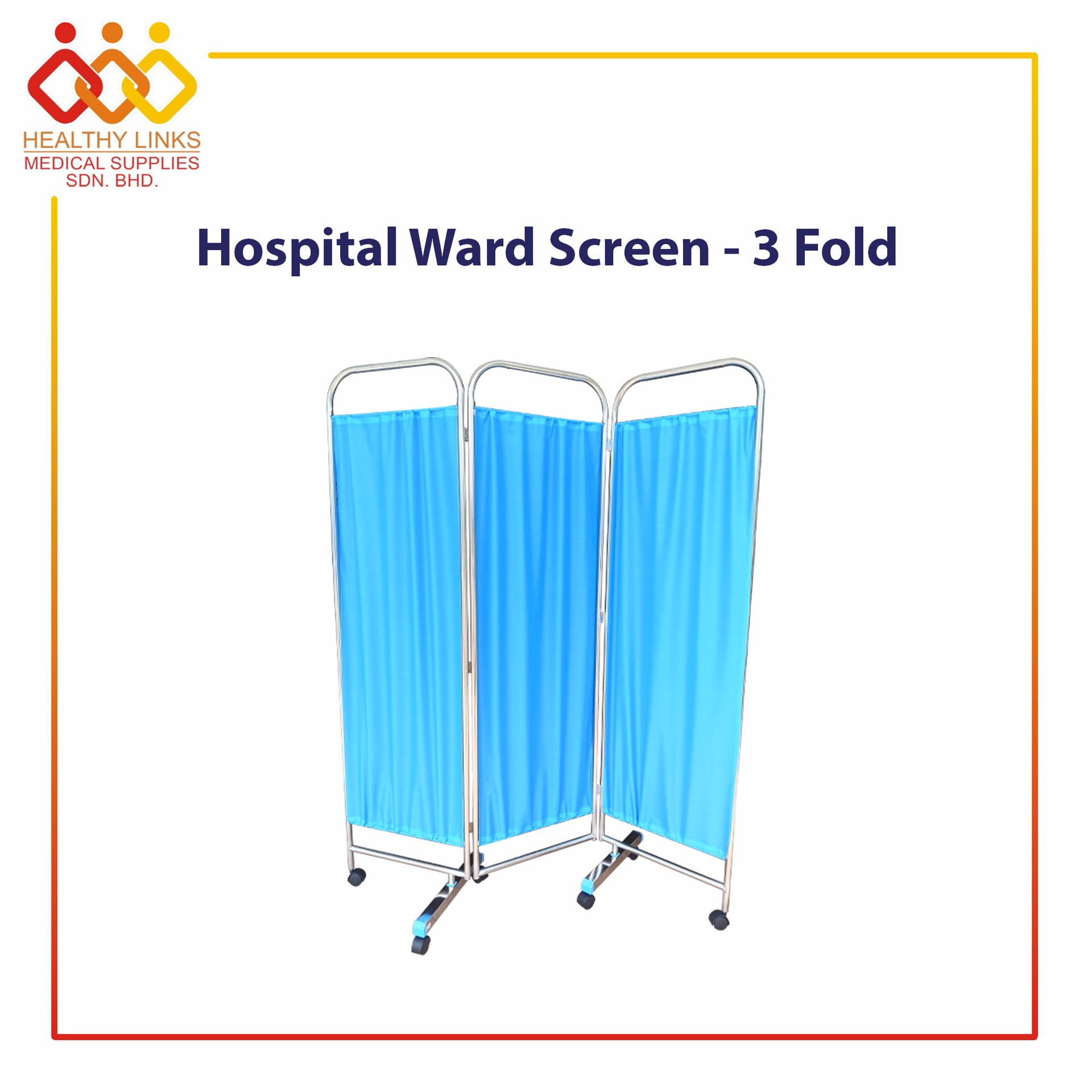 Hospital Stainless Steel Ward Screen With Blue Curtain - 3 Fold